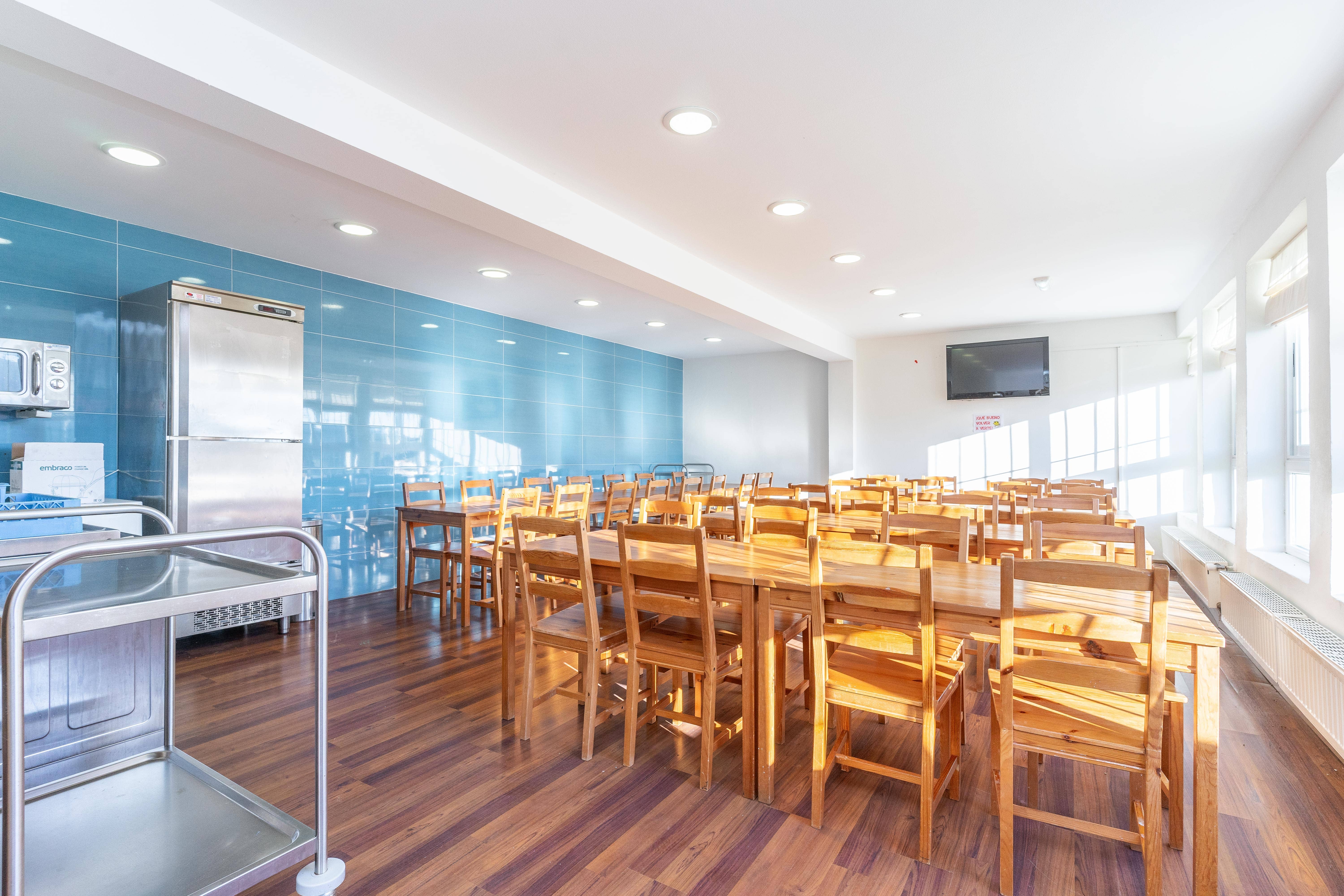 Dividido en dos plantas, en la inferior nos encontramos con el recibidor, comedor, cocina y una habitación grande. En la planta superior, disponemos de dos habitaciones grandes con dos baños separados (niños y niñas). Además, contamos con dos habitaciones dobles con baño para los monitores. Además, contamos con un amplio comedor donde se darán las 3 comidas diarias a los campers.