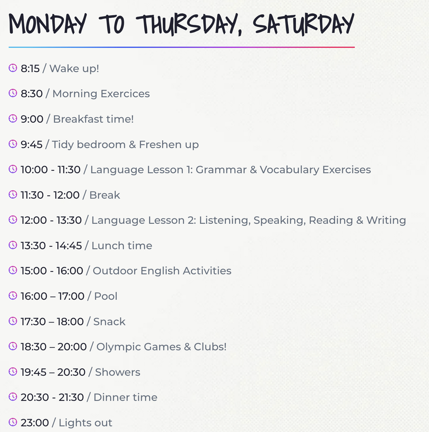 Cada mañana de lunes a jueves y el sábado los alumnos asisten a clase y reciben 4 horas diarias de lecciones de inglés impartidas por profesores nativos. Por las tardes, se realizan múltiples actividades como pueden ser: deportes, juegos, piscina, manualidades, actividades al aire libre… y cada noche, ¡una fiesta diferente! Los viernes y domingos no hay clases, se realizaran otro tipo de actividades como: excursiones por el entorno natural del centro, talleres creativos, Excursión opcional a Port Aventura World, etc.