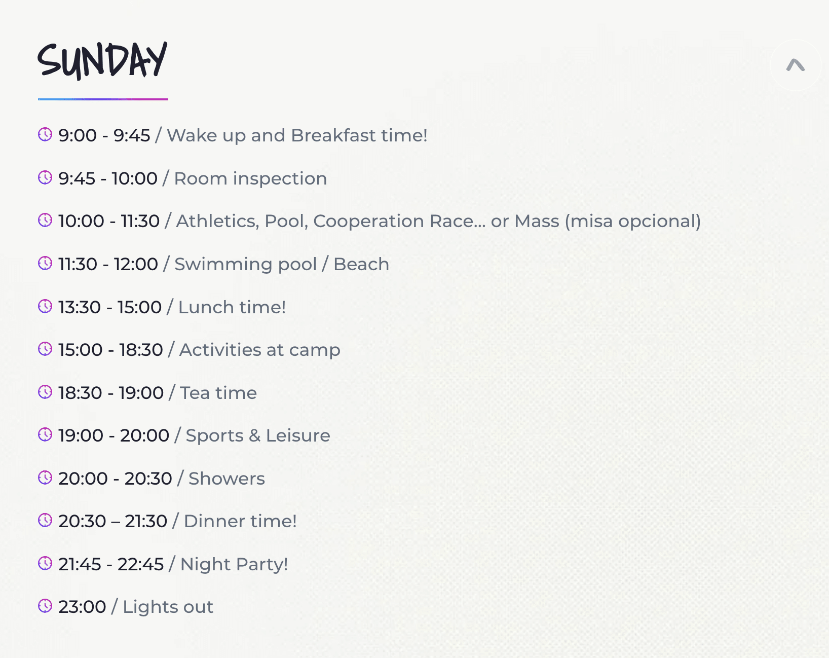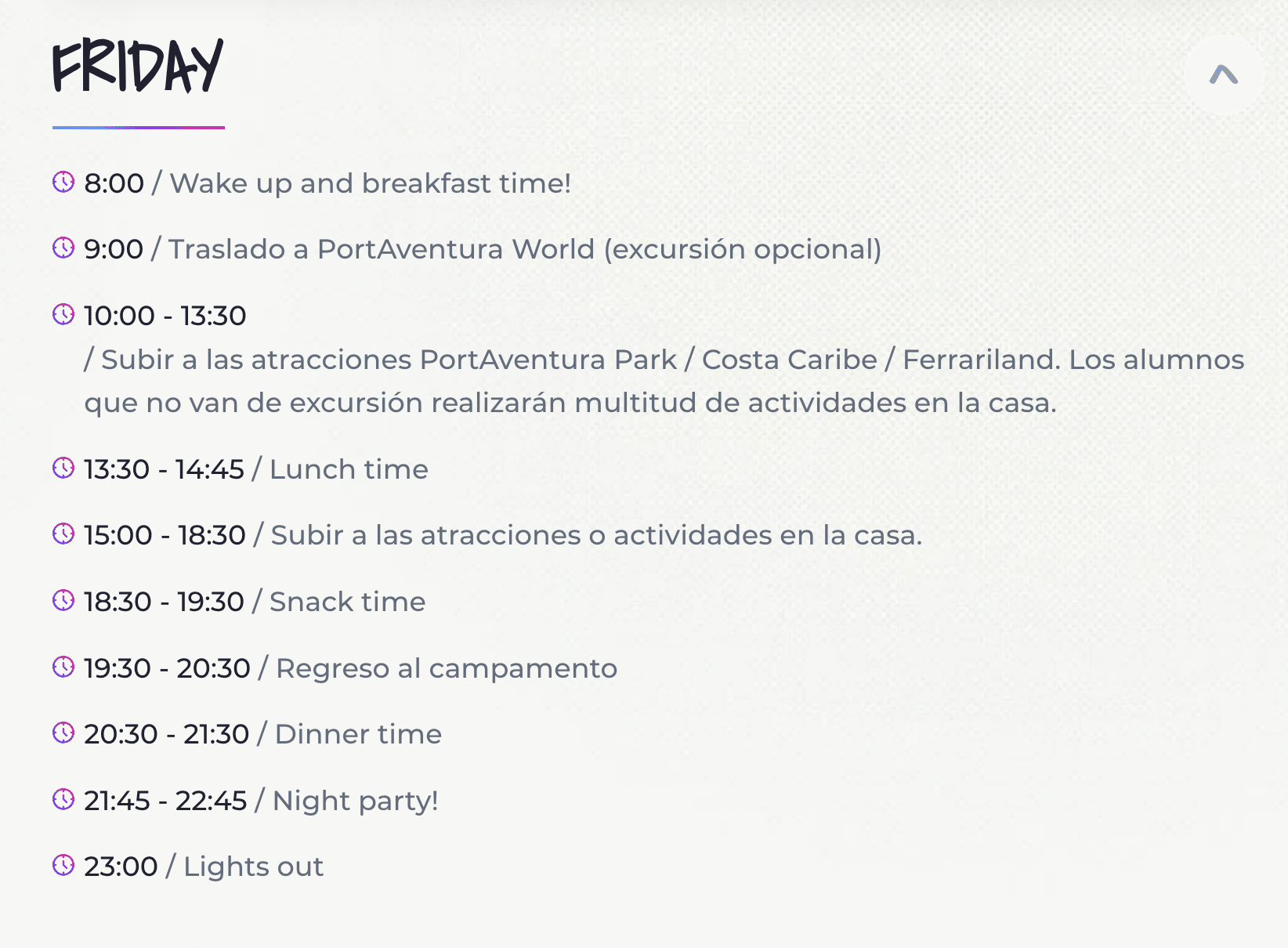 - Listado de actividades extras; se enviaran realizada la reserva (a partir del mes de Mayo), en el documento Parent´s Guide 2024, la guía específica con toda la información detallada de los cursos, actividades, traslados, lista de ropa necesaria,…Entre ellas destaca: