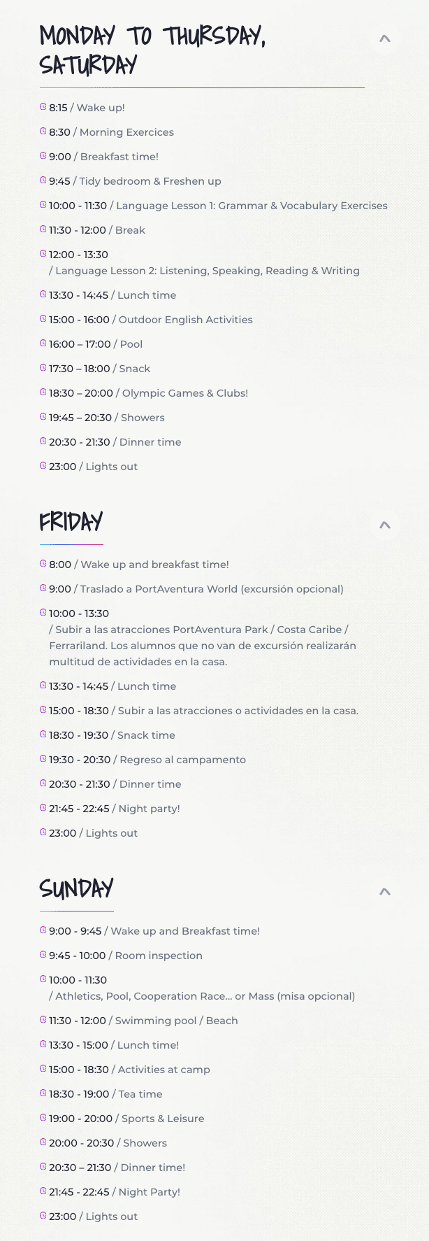 - Listado de actividades extras; se enviaran realizada la reserva (a partir del mes de Mayo), en el documento Parent´s Guide 2021, la guía específica con toda la información detallada de los cursos, actividades, traslados, lista de ropa necesaria,…Entre ellas destaca:
